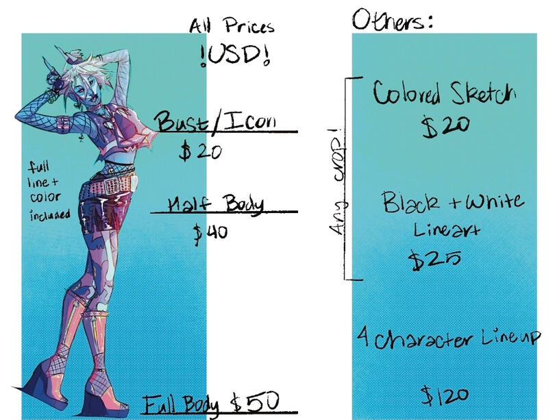 - All final pieces will have a signature that you are not permitted to remove.- I have the right to reject any order that I do not feel comfortable completing for any reason.- Nothing involving AI (Artificial Intelligence) of any sort will be permitted, full stop. I will not work with AI and nobody has my permission to use my art to train AI.- I will not work with NFTs and you do not have my permission to use my art for NFTs.- All prices are listed in USD. I can only accept payment through Ko-fi. PayPal and Venmo are also okay if we have done business in the past.- Prices are subject to change depending on specific suggestions or requirements for the commissions.- You do not have any right to distribute or sell my work for profit.- I retain all rights to my work and have the right to distribute or sell for profit, post on social media, and use to market unless you request otherwise. If you request I keep your commission private or keep your name/username anonymous, I will not use it anywhere you do not approve!- You are entitled to three changes in the sketch stage.- These commissions are digital only, and you will not receive a physical copy of anything I produce for you. If you want a print, let me know and I will put it on my INPRNT where you may buy a physical copy. If you want some other physical merchandise type, let me know and we can work out what merch type you want and I can put it on my ACG Goods store for purchase under a password protected listing only you and I will have access to. These WILL carry extra charges.- No refunds past the sketch stage UNLESS I state I am unable to complete your commission for any reason.- When commissions are closed you're more than welcome to ask to be put on a wait list!- Please expect a turnaround time of 2-3 weeks, I do fanzines and other personal projects alongside commissions. If it's expected to take any longer, I will contact you!